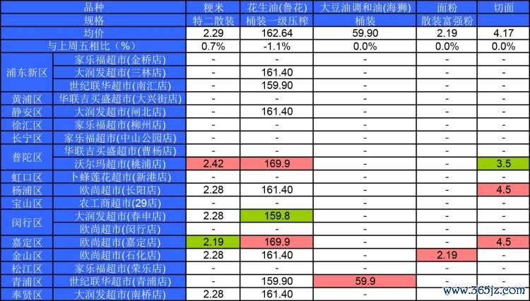 ■粉底标注代表该粮油品种在上述超市的最高价;绿底标注代表该粮油品种在上述超市的最低价。