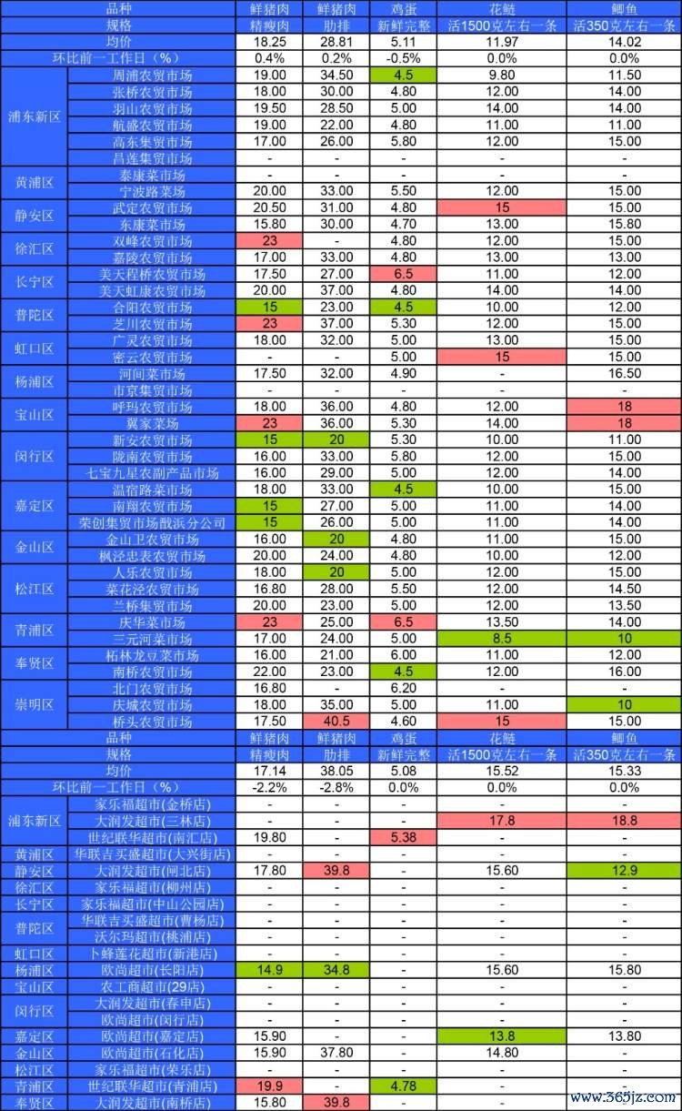 ■粉底标注代表该肉蛋鱼品种在上述农贸市场或超市的最高价;绿底标注代表该肉蛋鱼品种在上述农贸市场或超市的最低价。
