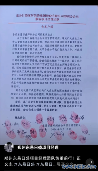 而在小红书书上,有一个名称为郑州东易日盛项目经理的账号,放出了一份《告客户函》,称由于东易日盛郑州分公司经营管理问题,造成广大业主工地停工暂时无法正常交付。